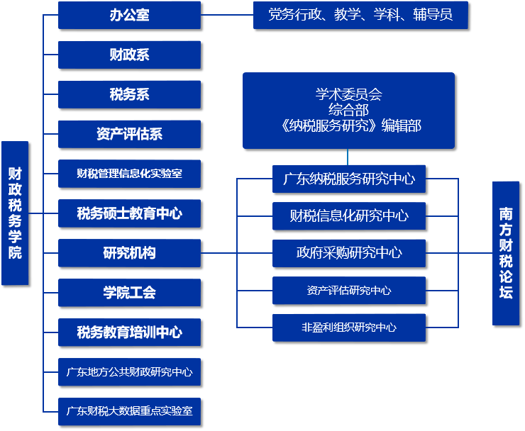 财政学学科为广东省优势重点学科,拥有财政学科学学位、税务专业学位、资产评估专业学位三个硕士学位授权点,拥有广东省人文社科重点研究基地“广东地方公共财政研究中心”和广东省重点实验室“广东财税大数据重点实验室”。学校与省财政厅签有共建财政学学科协议,财政理论与政策研究创新团队以及公共财政研究创新平台分别为中央支持地方高校发展专项资金支持项目。与省税务局共建广东纳税服务研究中心、与财税部门共建财税信息化研究中心,建有政府采购研究中心、资产评估研究中心、非营利组织研究中心等。