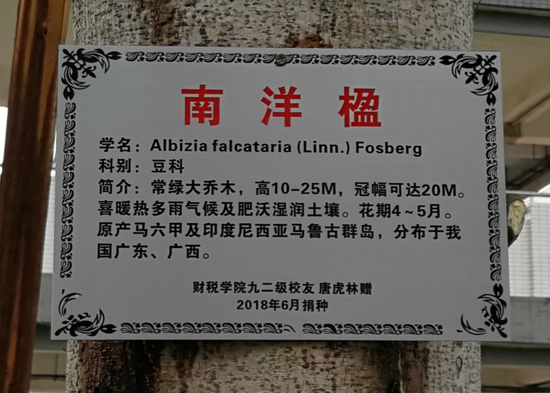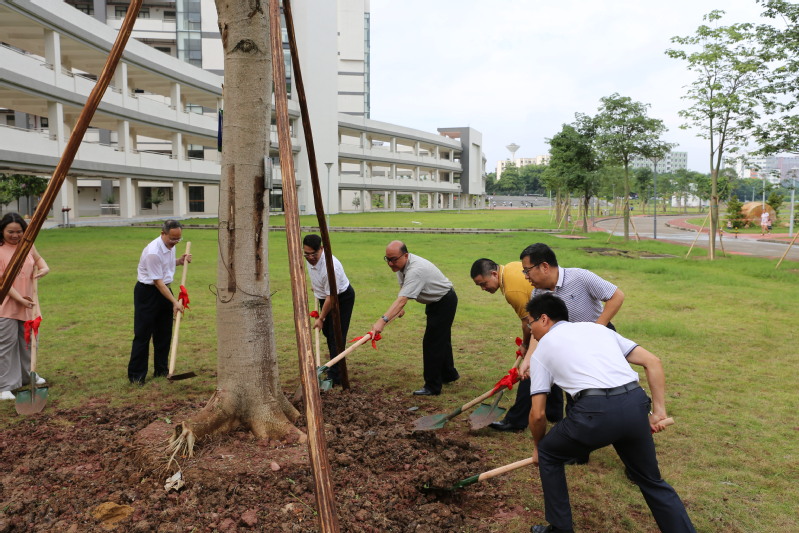 2018年6月5日,正值世界环境日,当天上午,m8892级校友、富瑭集团有限公司董事长唐虎林向母校捐赠“南洋楹”树一棵,学校党委书记黄晓波、副校长杜承铭与唐虎林校友一起为树苗培土、浇水,财税学院庞磊院长、朱信贵书记等五位院领导、校友办曹阳主任共同参与了培土仪式。