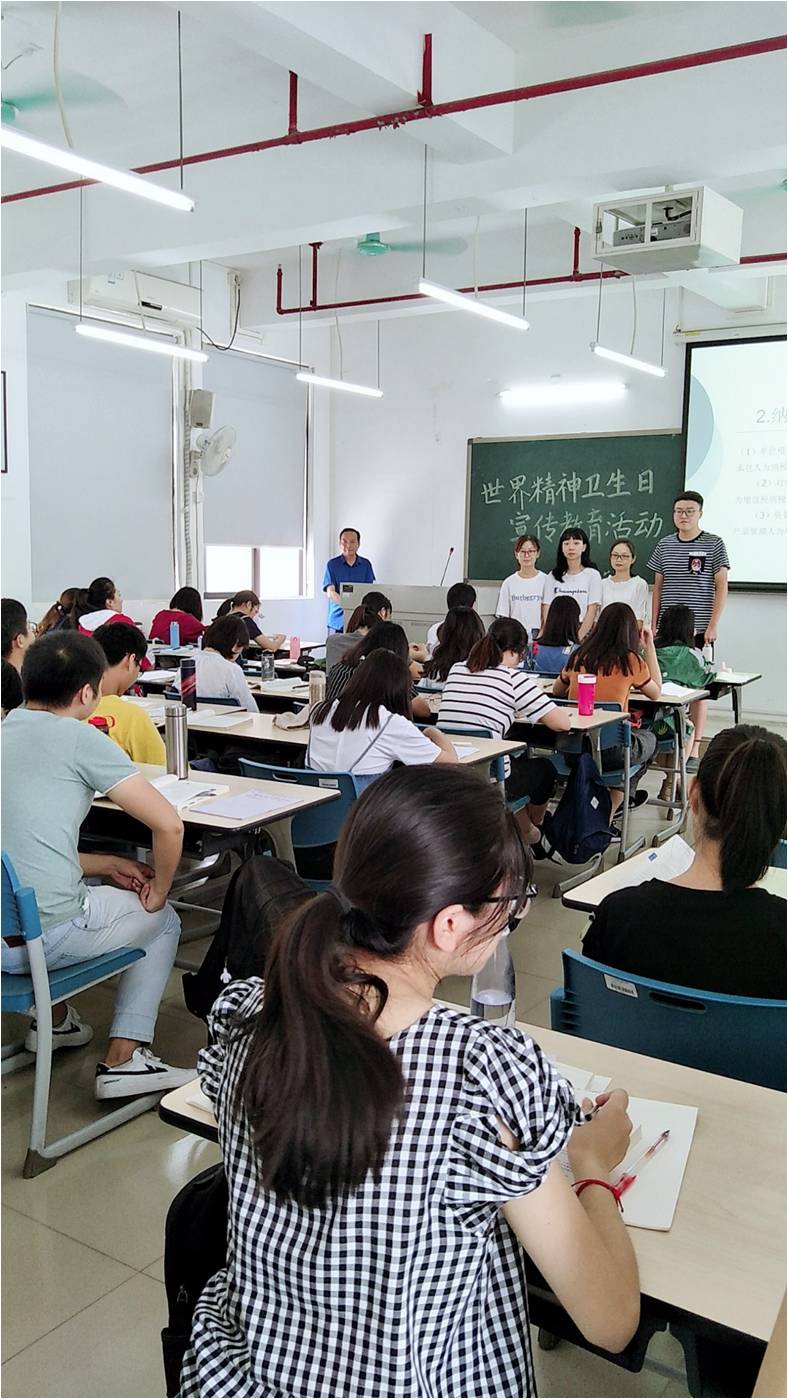 为了贯彻粤教体函(2018)71号文件精神,加强师生们对精神卫生教育重要性的认识,普及精神卫生和精神疾病知识,提高健康素养,促进师生的全面发展,m88于2018年10月9日上午课间二十分钟在北三教学楼403课室举办了以“师生健康,中国健康”为主题的世界精神卫生日宣传教育活动,并邀请了m88的石卫祥老师参与。