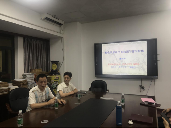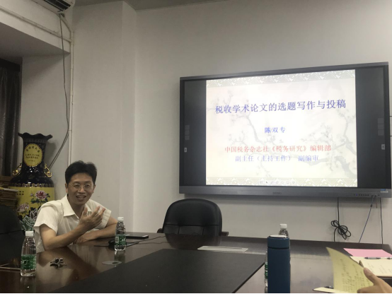 陈主任首先向我们介绍了税收学术论文的特点以及写作前需要注意的几点问题,并且强调学术论文不可缺少核心观点和论证框架让在学生对于学术论文有了更深的了解和认知。除此之外,陈主任还介绍了税务研究的选题方向以及选题计划,主动和在场师生进行探讨,让我们收获颇丰。