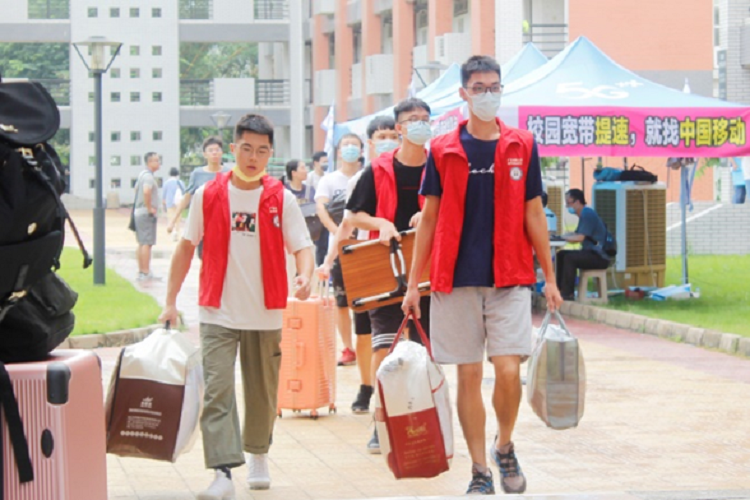 9月12日,2020级新生正式入校报到。学校积极响应抗击新冠疫情的号召,采取了家长不得陪同进园区、学生入园区前测温等措施。除学院志愿者外,党支部和大二班级同学也组成了“迎新生志愿服务队”,他们以最充足的准备、最饱满的热情迎接每一位新同学的到来。志愿者们都做好防疫措施,热情地为新生及家长指引道路、解答疑惑、搬运行李。