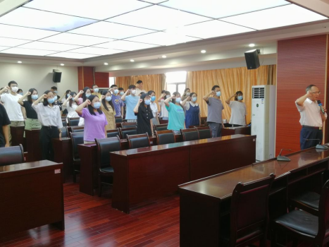 为庆祝中国共产党成立100周年,铭记党的奋斗历程,感悟党的初心使命,2021年6月25日上午,m88党委在北二338举行入党宣誓大会。m88党委书记朱信贵、副书记董锦红、辅导员郑晓丹、黄迪,40名新发展党员参加此次会议,大会由朱信贵书记主持。