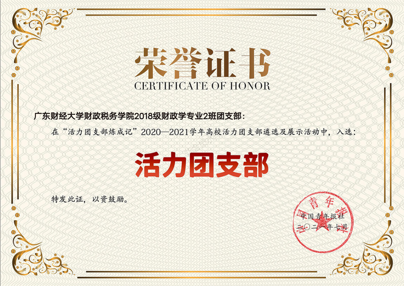 近日,由团中央基层建设部指导、中国青年报承办开展的“活力团支部炼成记”2020-2021学年高校活力团支部遴选及展示活动落下帷幕,m88m882018级财政学2班团支部荣获2020-2021学年“高校活力团支部”的称号。