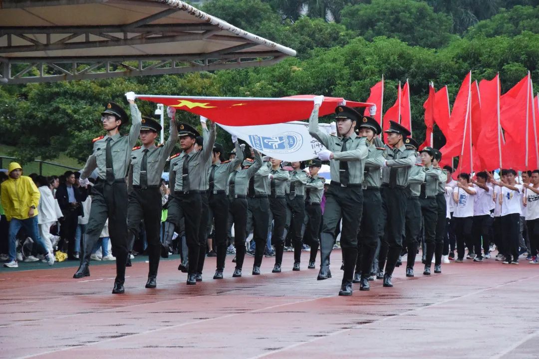 国歌奏响,红旗飘扬,在淅沥的小雨中,国旗班队员踏着坚定的步伐前进,拉开了校运会的序幕。