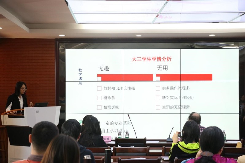 参赛选手是邝艳华副教授和李梅香副教授。邝老师讲授了《政府管理预算》,以数据和案例作为切入点,课堂内容扎实丰厚,有理有据;李梅香老师讲授《二手车技术鉴定》,运用翻转课堂的教学方法,思路清晰,PPT简洁明了。两位参赛选手教态大方,授课内容设计精妙,教法多样,课堂活跃,充分展示了各自的教学魅力,现场的精彩展示得到了评委和观摩教师的热烈掌声。