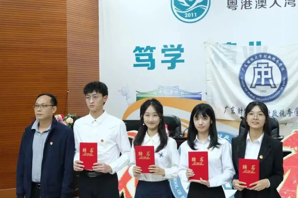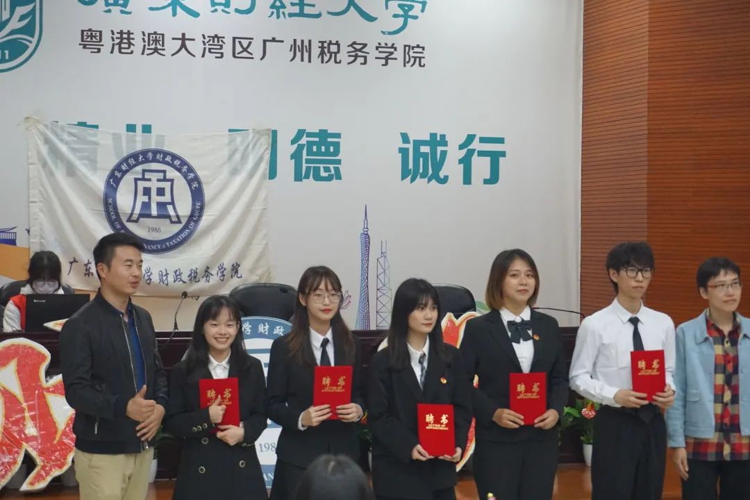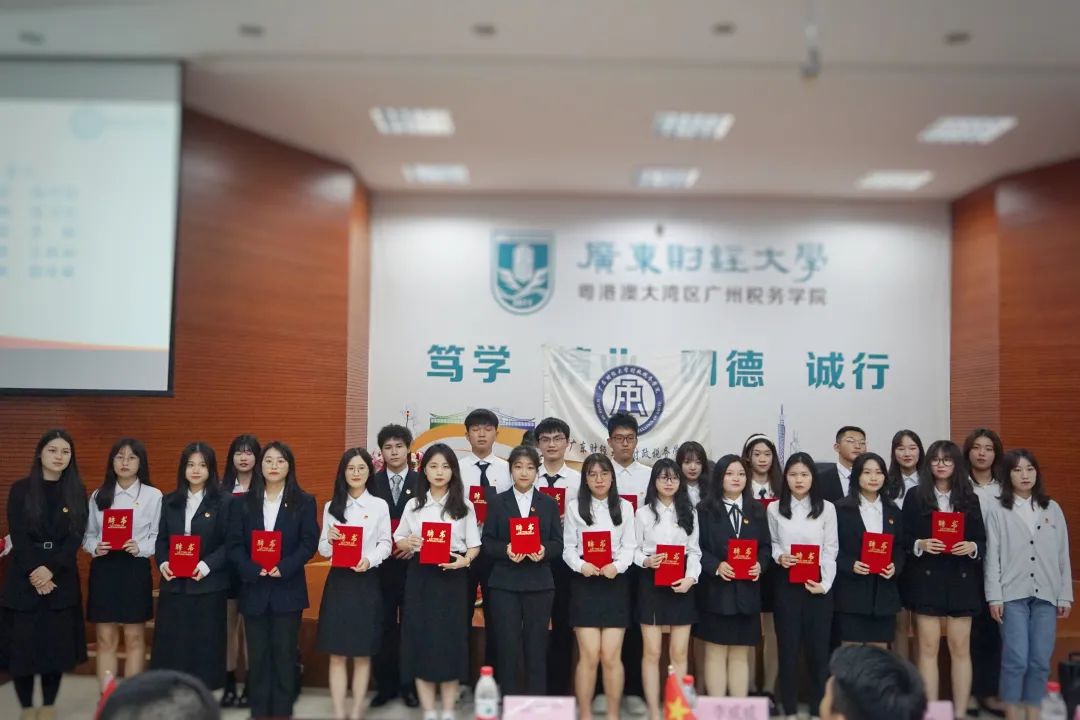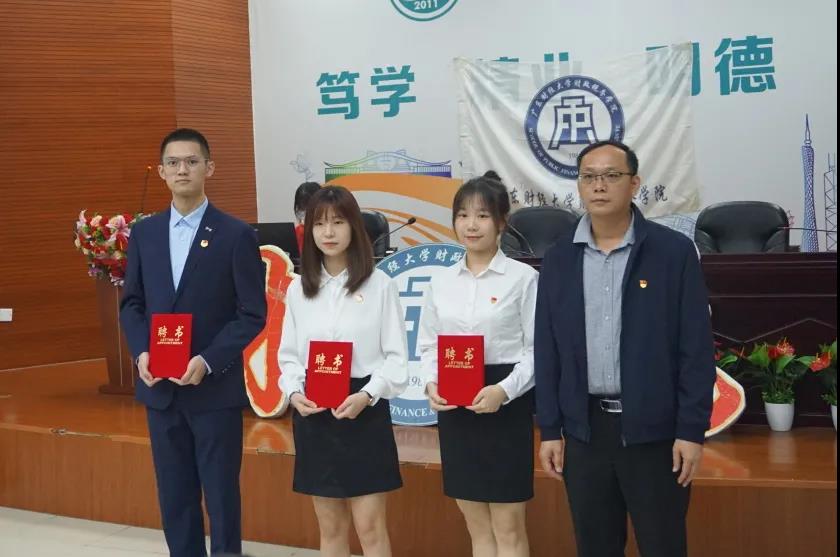 学院党委副书记李愿方、学院学生团委书记兼21级辅导员李威威、佛山校区20级辅导员周晶、佛山校区团委书记兼20级辅导员张丹丹、佛山校区21级辅导员周梦爔分别为广州和佛山校区常委、广州校区部门负责人、佛山校区部门负责人颁发聘书,并合影留念。一纸红书,传递的是信任与责任。
