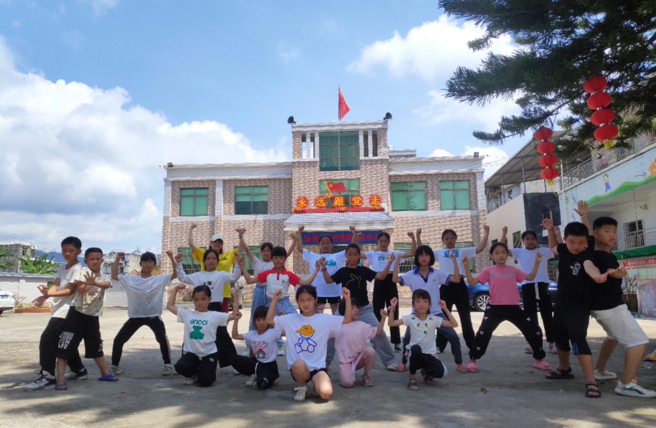 团队还特别邀请到了广州街舞行业团委书记黄丽丽校友一起加入这支有爱的团队。冒着炎炎烈日,为村里的孩子教授红色街舞——“龙的传人”,以街舞演绎中国故事,激发儿童民族自豪感,弘扬正能量,传递爱国情。