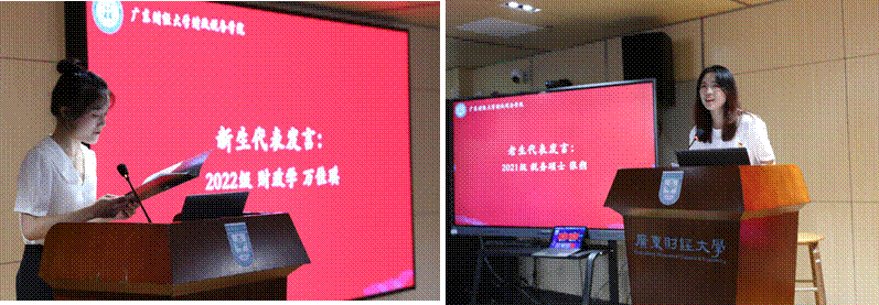 2021级税务硕士研究生张朔作为老生代表,结合自身的体验给师弟师妹们提出了确定目标、高效利用教学资源,锻炼身体的建议。2022级财政学研究生万佳琪作为新生代表发表了自己对未来的憧憬以及认真学习专研的决心。