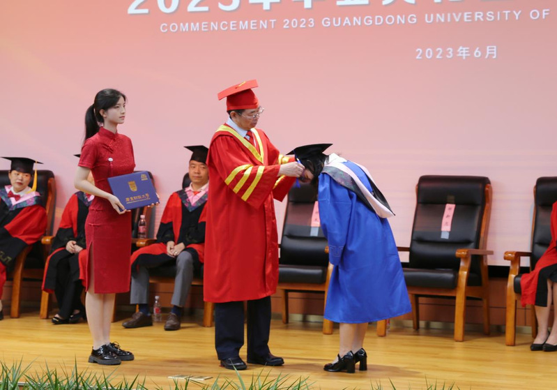 拨穗仪式是毕业典礼的重头戏,也是毕业生们最难忘的时刻。在拨穗仪式前,党委书记吴瑛宣读了学校关于授予2023届毕业生学士、硕士学位的文件。她向获得学位的毕业生表示祝贺,并祝愿毕业生们乘风破浪,筑梦远航。