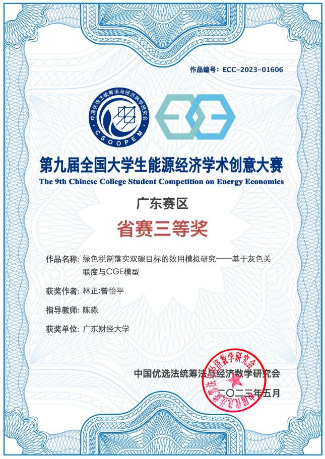 第九届全国大学生能源经济学术创意大赛广东(含港澳台)赛区省赛于4月16日圆满落幕。经过激烈的论文评审及答辩角逐,m88本科2020税收学四班的林正、曾怡平两位同学在省赛中荣获三等奖。