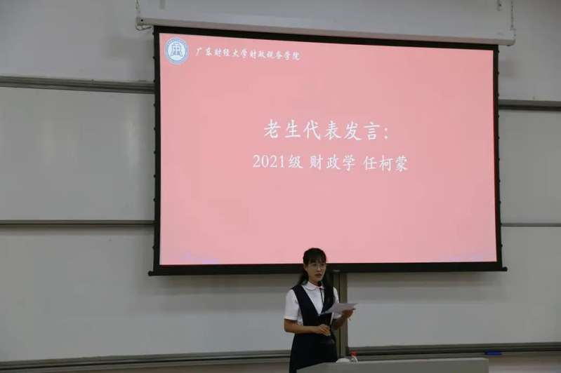 2021级财政学生代表任柯蒙代表学院老生,热烈欢迎并祝贺2023级新同学的到来。她分享了五点建议,帮助新同学更好地适应硕士研究生生活。首先,强调明确目标,早日明确职业或学术目标并积极寻求指导。其次,坚持学习,勤奋自律,恪守学术道德。第三,培养能力,锻炼自我。第四,学会理解与宽容,培养良好人际关系。最后,珍惜时间,充分利用学校资源,实现个人梦想。