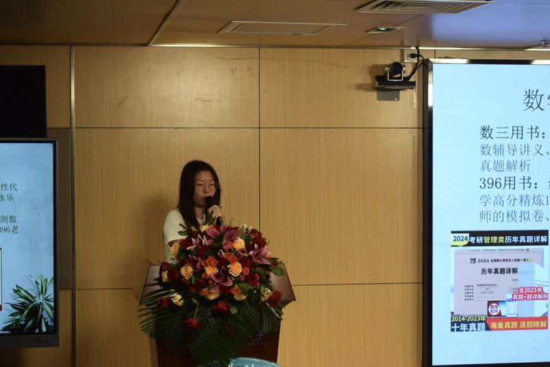 2023级资产评估研究生沈莹莹发言,她结合自身实际备考情况,向同学们分享在数学、英语、政治和专业课的考研经验,从用书、听课和复习经验三个方面娓娓道来,深化了同学们对考研的认知,激励同学们设立目标并奋发向上。