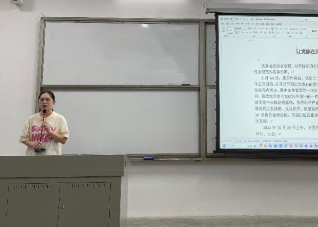 资产评估学生党支部书记张丹丹强调了入党的规范流程以及注意事项,并带领发展对象仔细研读党章修正案。她指出党章修正案对于坚持党的全面领导、推进全面从严治党和加强党的建设具有重要性意义。张丹丹用生动鲜活的案例让同学们认识到,作为一名发展对象,要关注党组织生活,在关键时刻勇敢担当,积极参与党的各项工作,发挥党员的先锋模范作用。