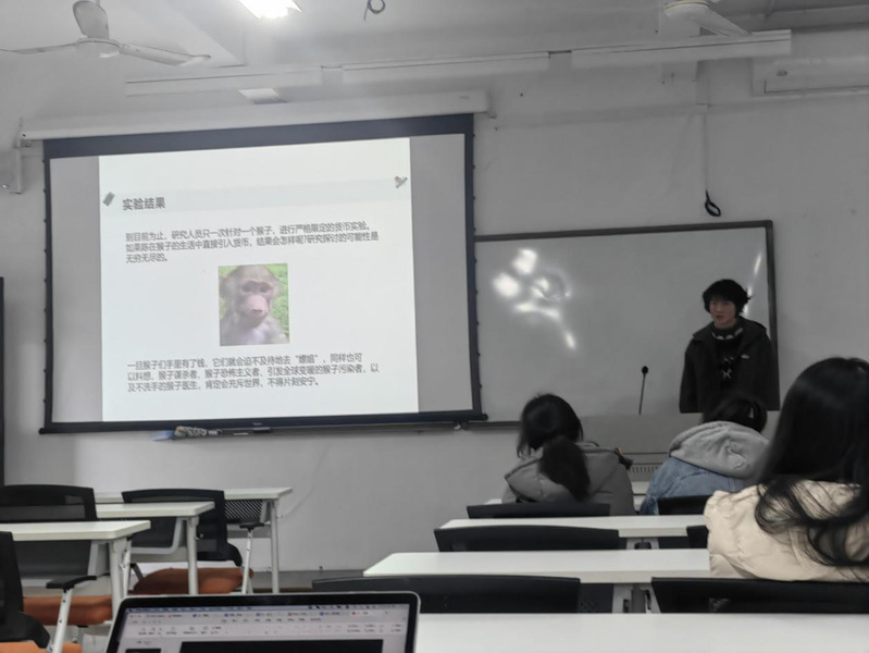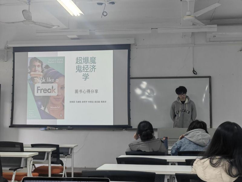 第二个小组的贺炯霖同学开场分享了为什么阅读《超爆魔鬼经济学》这本书籍,他认为本书不像经济学原理那样充斥着大量的定理、公式,而是旨在以经济学为工具解释生活中普遍存在的现象之间的因果关系,所以更具有趣味性,特别适合闲暇时观看或者经济学入门。随后马靖凯同学和大家一起进行了书上有趣的游戏和实验:如果我能教会猴子使用货币,那又会是什么情形呢?游戏引起我们同学对猴子学会使用货币的无尽畅想。