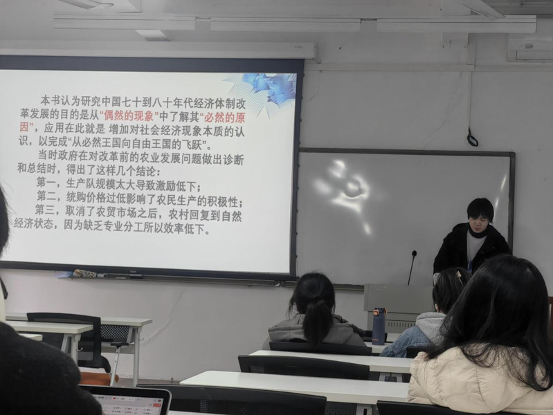 第一小组的潘湘怡同学讲述了林毅夫老师撰写本书的历程,作者在书中总结了中国与其他国家、地区经济发展和改革活动的经验,提出了一个经济发展和转型的一般理论,并以此理论分析中国在改革和发展过程中取得的各项成就及面临的主要经济社会问题。接着,刘松林同学对农村和城市的改革问题进行具体分析,提到中国七十到八十年代经济体制改革发展的目的是从“偶然的现象”中了解其“必然的原因”,总结了我国城市改革面临的问题。随后,小组李杰同学和宋柯然同学分别分享了市场化改革、国有企业改革、金融体系改革等对中国改革经验的总结。