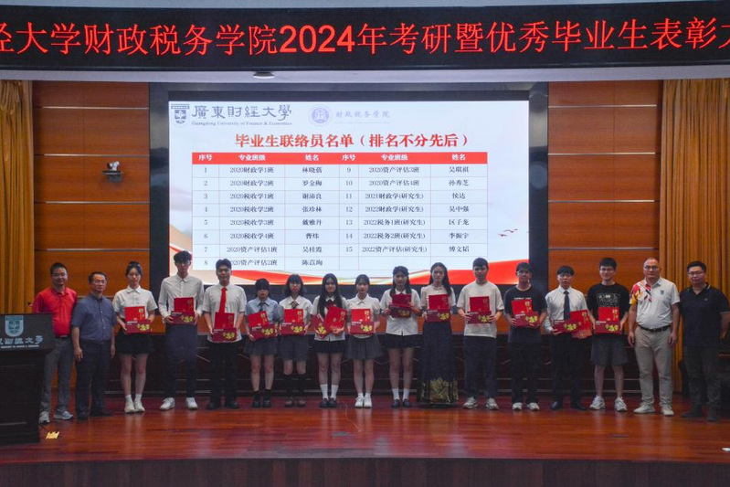 吴瑛书记宣读了学校关于优秀毕业生的表彰决定以及m88《关于表彰2024届考研先进个人的决定》,对2024届考取博士研究生的3名硕士毕业生和考取硕士研究生的41名本科毕业生予以表彰,同时财税校友基金会给予考取博士研究生的同学每人1000元的奖励,给予考取硕士研究生的同学每人500元的奖励。吴书记希望受表彰的同学,在今后的学习中再接再厉,勇攀知识高峰;同时号召全院学生向受表彰的同学学习,树立远大志向、刻苦钻研、勇于创新、积极进取,努力成为德才兼备、全面发展的高素质财税人才。