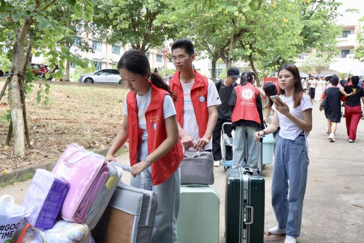 迎新现场,志愿者成为了最亮丽的风景线。他们高举手持牌,为新生搬运行李、指引路线、解答疑问、拍照留念,用心用情为新生踏上校园的第一站保驾护航。