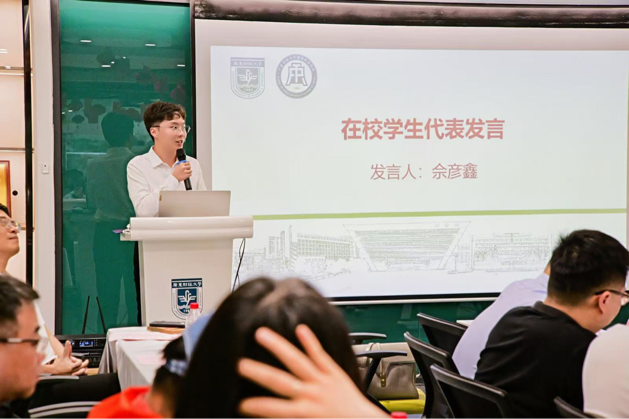 在校学生代表佘彦鑫同学进行发言,以在校生的视角,阐述了校友会在凝聚全体财税师生力量中的重要意义,并代表在校学生表达对校友会的感激之情。同时也代表同学们对校友基金会提出了两点希望,一是希望在未来能够举办更多面向同学们的特色活动,而是希望能进一步推动产学研深度融合,为同学们提供更多的专业实践机会。