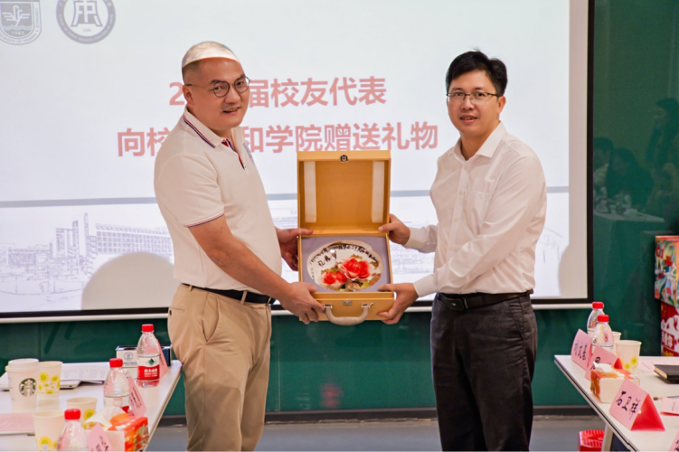 在交流分享会即将结束时,2004届校友代表邵建盛向校友办和学院赠送了礼物,表达了他们对母校的感恩与祝福。