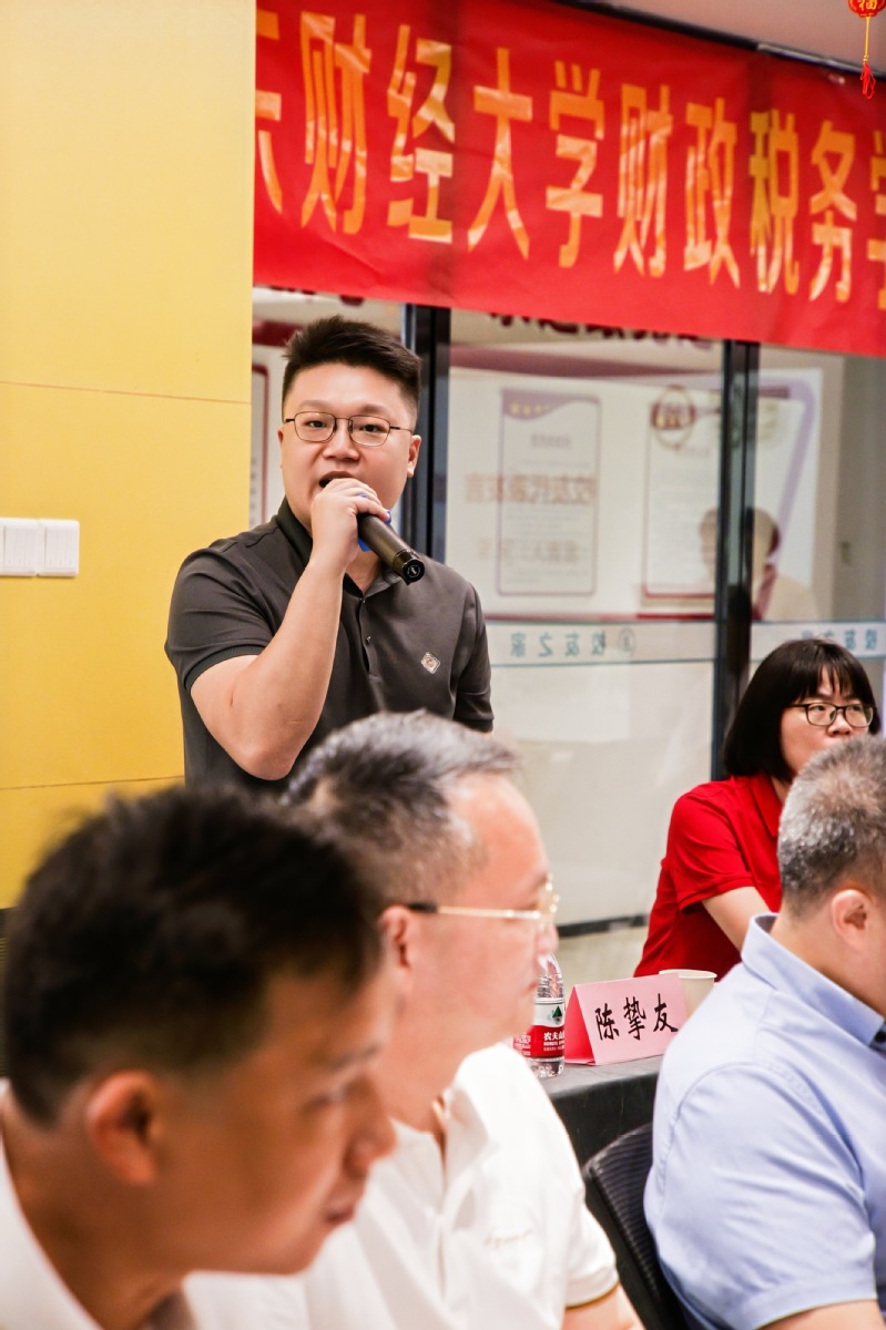 在校学生代表佘彦鑫同学进行发言,以在校生的视角,阐述了校友会在凝聚全体财税师生力量中的重要意义,并代表在校学生表达对校友会的感激之情。同时也代表同学们对校友基金会提出了两点希望,一是希望在未来能够举办更多面向同学们的特色活动,而是希望能进一步推动产学研深度融合,为同学们提供更多的专业实践机会。