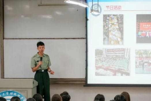 2023级资产评估一班的招俊宇曾服役于中国人民解放军驻香港部队,该部队主要负责稳定香港态势,捍卫国家主权。讲座上,招俊宇同学提到,部队日常训练会比较严格,且会涵盖多种科目,但在训练之外,部队节日活动丰富,队伍集体庆祝节日时十分温馨。另外他向大家介绍了军营开放活动,表示活动能够展示部队良好作风和先进武器,可以拉近军民关系,同时他鼓励大学生培养坚韧不拔的意志和团队合作的精神。