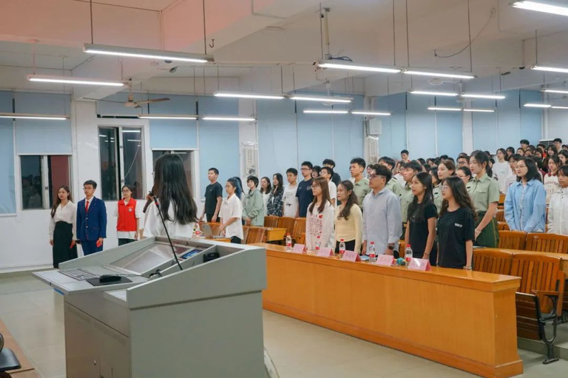 伴随着庄重激昂的国歌奏唱中,“激发青年爱国情,筑就青春国防梦”国防教育讲座拉开序幕。