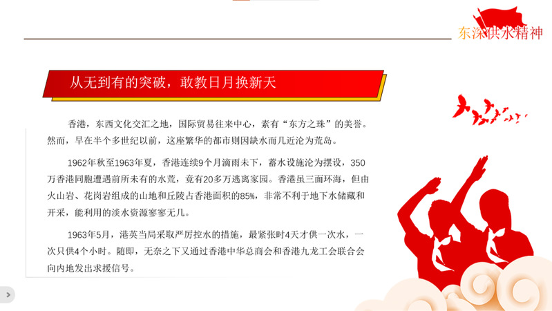 1963年为解决香港缺水问题,广东省引东江水供应香港。在党组织的带领下,建设者们不畏艰险,夜以继日,全身心投入工程建设,他们在工棚里睡觉,与暴风雨对抗,甚至有人付出了生命,在这背后包含的是他们忠于祖国忠于党、心系同胞的家国情怀,同时他们也向我们展现出了勇担重担、甘于奉献、艰苦奋斗的精神。让我们翻开这一历史篇章,了解一滴水的故事,深入感悟中国共产党人精神谱系中的南粤印记。