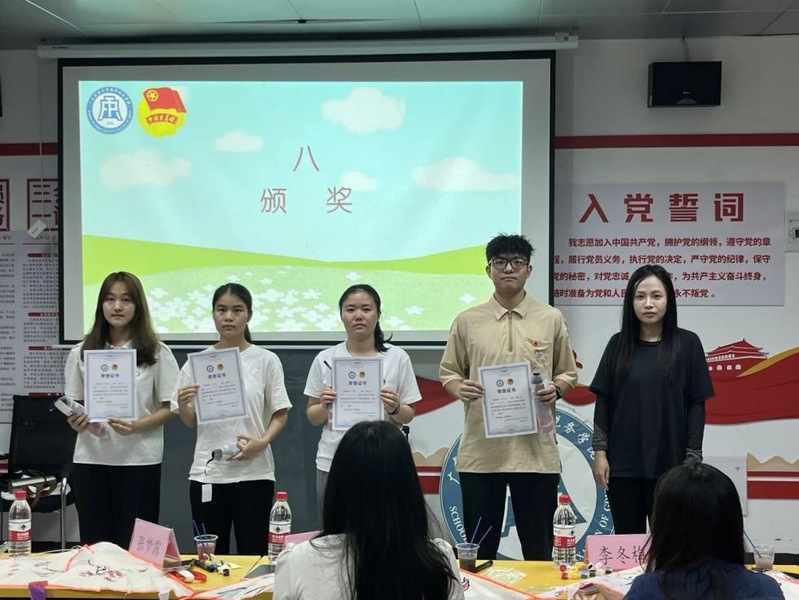 在投票环节中,我们票选出了一、二、三等奖。m88团委书记张梦露老师、m88团委第一副书记郑苗莹同学为优秀小组颁奖。