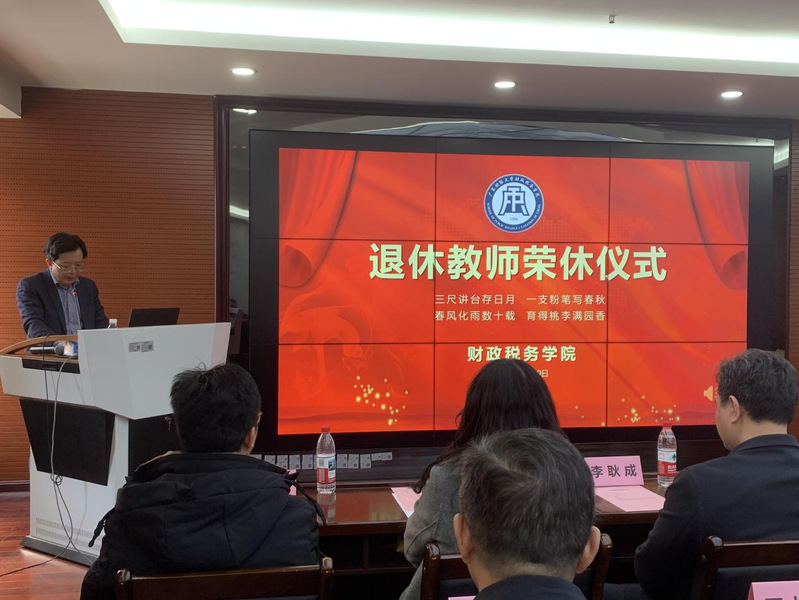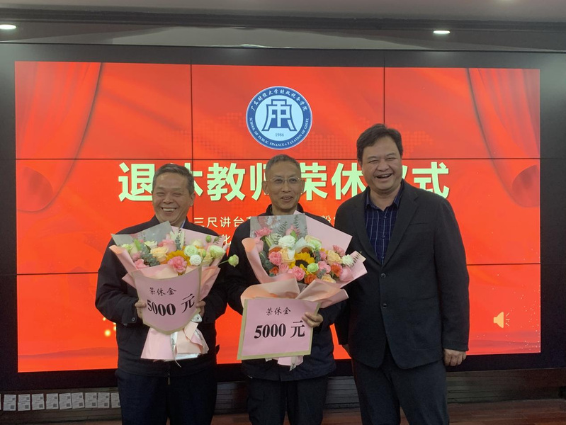 会议前还为退休教师王根贤和敖卫平两位教授举办了荣休仪式,院长李林木代表学院向两位退休教师表达了良好的祝愿,并鼓励青年教师继承和发扬老教师们勤奋敬业、严谨治学、潜心育人的风范和精神,紧抓机遇,不断进取,为大湾区一流财经大学的建设贡献力量,学院校友基金会李耿成副会长为荣休教师颁发了荣休金。