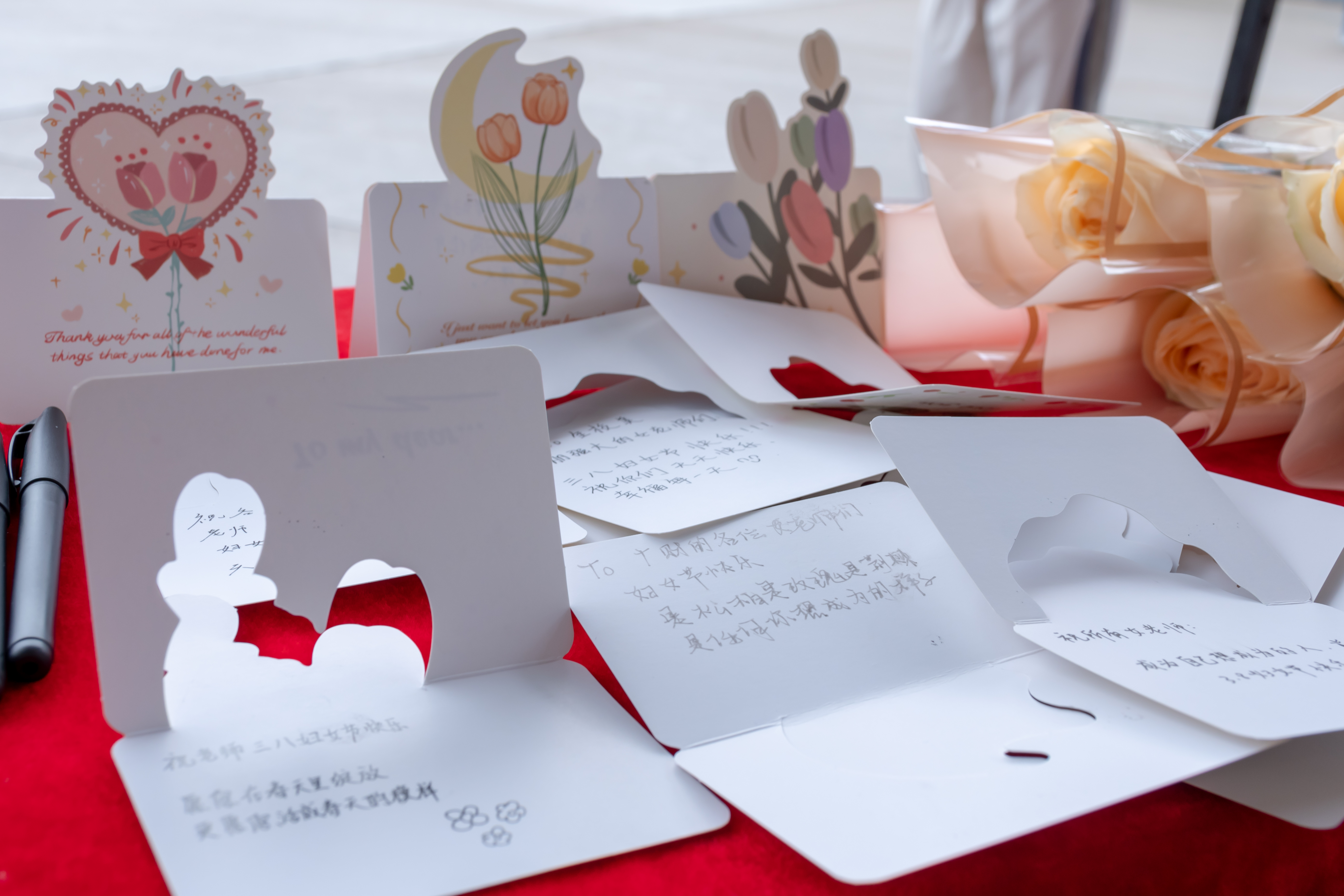 活动现场摆放着种类多样的明信片,同学们挥笔写下温暖人心的话语。大家在明信片中写下美好祝福,传递最真挚的感情。愿每一位女性都能够努力活成自己想要的样子,学会爱自己,就是幸福的起点,祝所有女性节日快乐!愿所有的女性在未来都可以卓然而立,在属于自己的领域里绽放出独特的光芒。