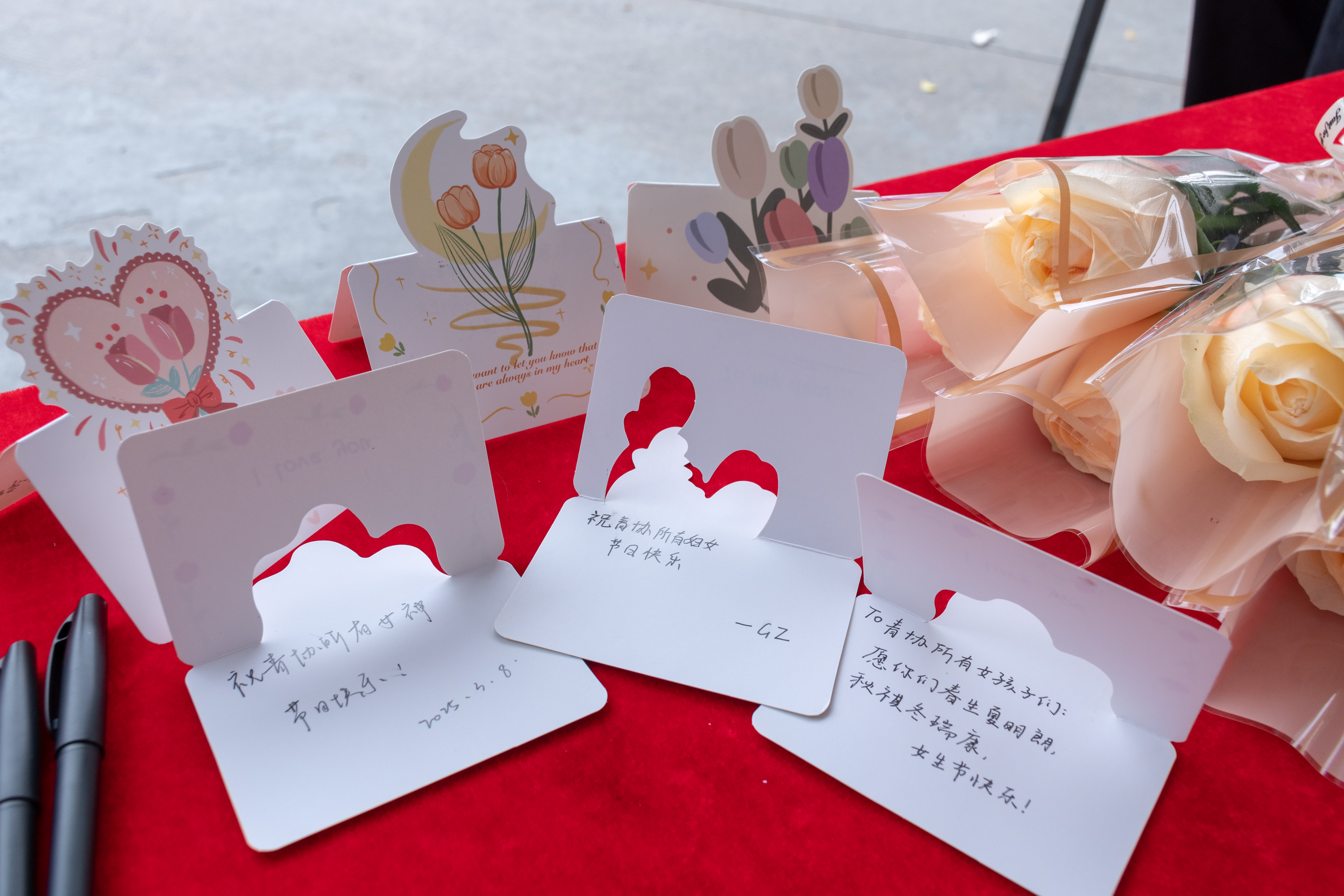 生活中处处充满“她”的力量,在这个特殊的日子,同学们纷纷用自己的文字,致敬每一个她。活动渐进尾声,工作人员将同学们写好的明信片与提前准备的鲜花,一起送给身边的女性们,并为她们献上节日祝福,以表达对她们辛勤付出的感谢。