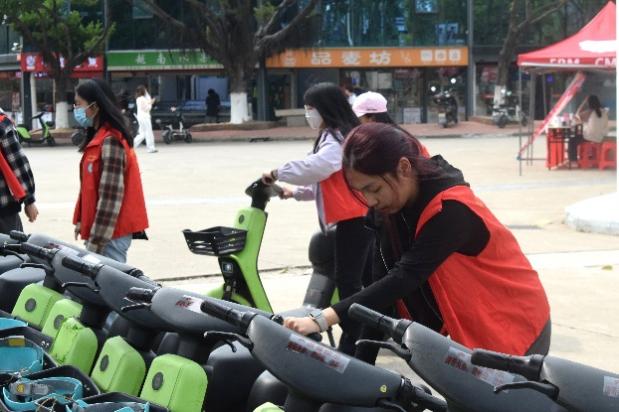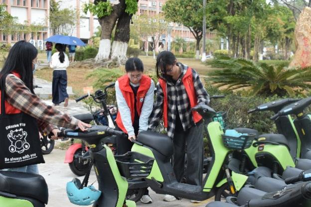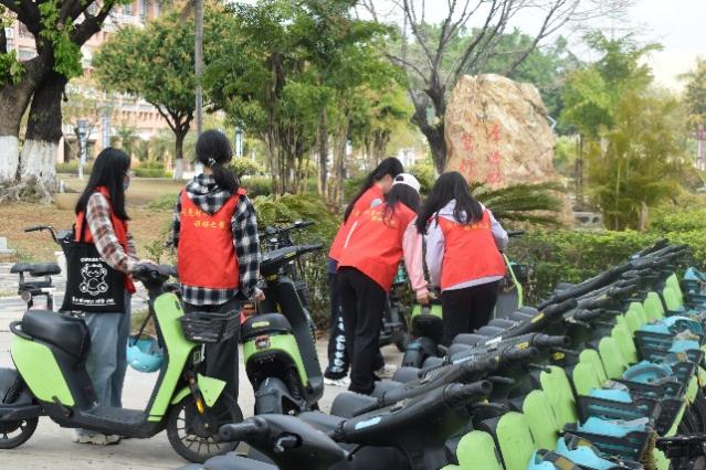 志愿者们化身为秩序守护者,耐心地将乱停乱放的电动车移动到指定位置,并细心调整车辆的朝向与间距,确保车辆整齐划一。经过志愿者的共同努力,停车区域变得井然有序,为学生们提供了一个更加安全、便捷的停车环境。