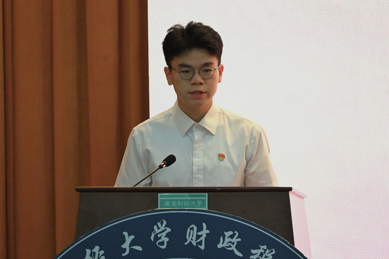 优秀本科生代表邓雅深切表达了对学校和学院精心培育的感恩之情。她表示,这份师生情谊与谆谆教诲是她一生的宝贵财富,必将铭记于心。她以“厚德、励学、笃行、拓新”的校训为主题,回顾了在广财四年的求学时光,向师生们分享了她从学术科研到创新创业,从专业学习到校外实践,的成长历程。她认为凡是贵在坚持,要脚踏实地,踏实做事。她寄语师弟师妹们牢记“精财通税,经世济民”的初心,在建设祖国、服务社会发展的征程中以实际行动彰显财税人的使命担。